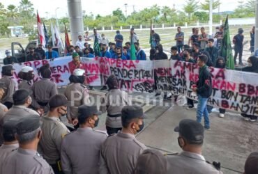 Puluhan massa aksi dari Aliansi Amanah Penderitaaan Rakyat (AMPERA) melakukan demontrasi terkait kenaikan BBM di depan Kantor Wali Kota Bontang, Senin (12/9/2022).