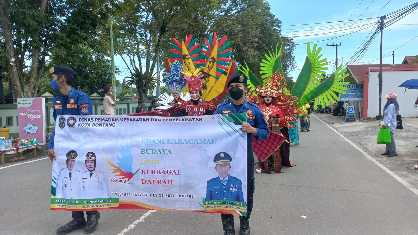 Dalam kegiatan tahunan ini, personel Disdamkartan tampil memukau dengan kostum berwarna cerah, namun tidak menghilangkan karekter khas pemadam yang tetap membawa tabung apar dan pelatan lainnya.