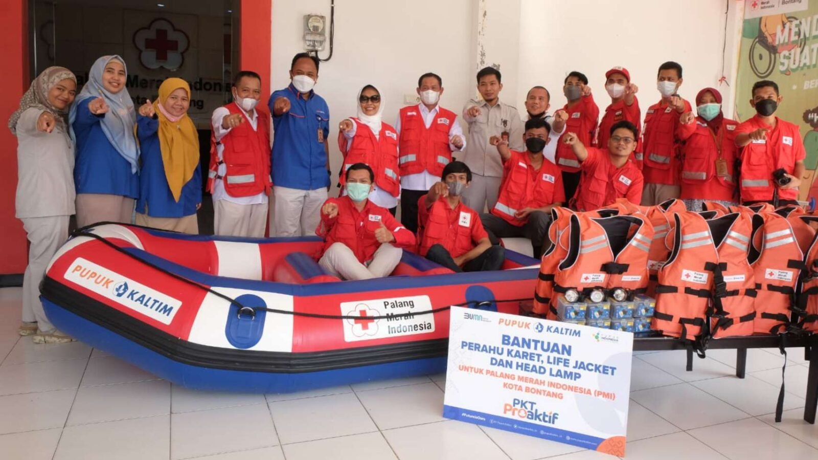 Populism.id, Bontang – Dukung aksi sosial kemanusiaan dan kepalangmerahan, PT Pupuk Kalimantan Timur (PKT) salurkan bantuan satu unit perahu karet beserta 8 unit life jacket dan 8 headlamp ke Palang Merah Indonesia (PMI) Kota Bontang.