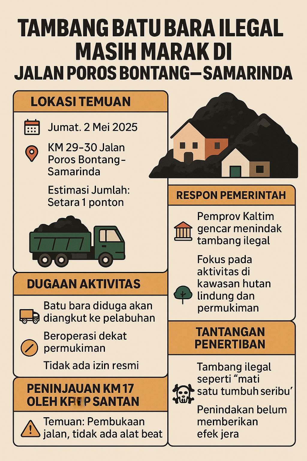 Bontang – Kawasan hutan lindung di Kilometer 29-30, di Jalan Poros Samarinda-Bontang (Sambo), kembali terpantau eksplorasi liar pertambangan batu bara tanpa izin negara atau ilegal mining, Jumat (2/5/2025).