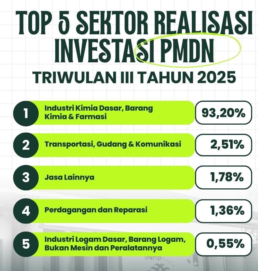 Bontang – Dinas Penanaman Modal dan Pelayanan Terpadu Satu Pintu (DPMPTSP) Kota Bontang mencatat sektor industri kimia dasar, barang kimia, dan farmasi menjadi penyumbang terbesar dalam realisasi investasi Penanaman Modal Dalam Negeri (PMDN) triwulan III tahun 2025. Sektor ini berkontribusi hingga 93,20 persen dari total investasi yang masuk ke Kota Bontang.