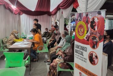 Pedagang Pasar Taman Rawa Indah (Tamrin) ramai-ramai datang ke gerai vaksin Covid-19 yang di buka Badan Intelijen Negara, Sabtu (16/7/2022).