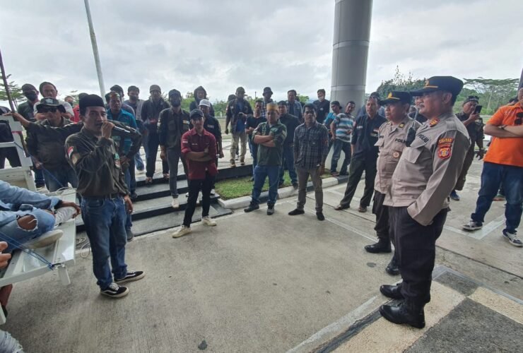 Puluhan orang yang tergabung dalam Federasi Serikat Pekerja kimia, energi dan pertambangan (FSKEP) yang menggelar aksi, di depan Kantor Wali Kota Bontang, Senin (5/6/2023) pagi. ...